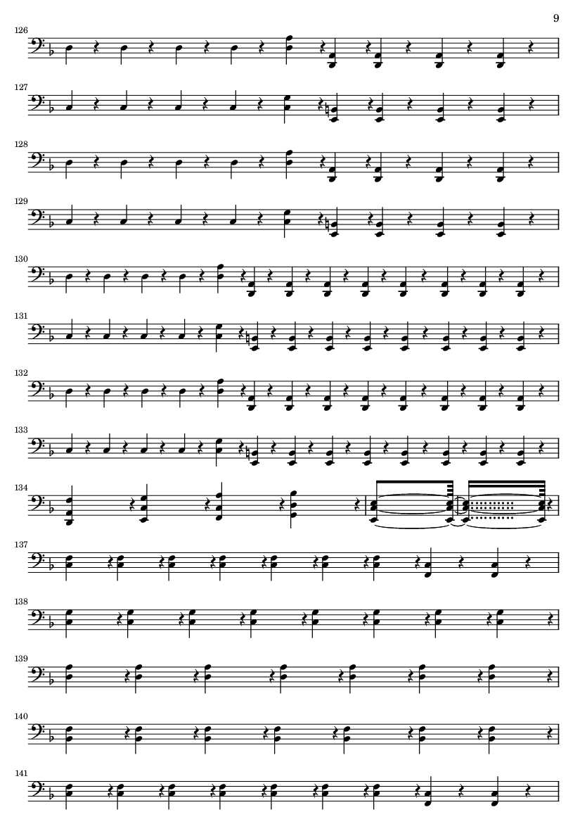 | 1 | 2 | Distortion Guitar | | 2 | 3 | Distortion Guitar | | 3 | 4 | Distortion Guitar | | 4 | 5 | Electric Bass (pick) | | 5 | 10 | Drawbar Organ | | 6 | 8 | Tremolo Strings | | 7 | 12 | Tremolo Strings | | 8 | 15 | Tremolo Strings | | 9 | 2 | Tremolo Strings | | 10 | 0 | Acoustic Grand |